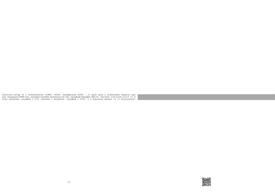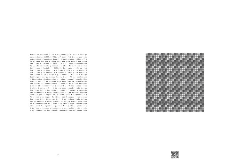 "Código Concreto" é um livro que se inspira na tradição da Poesia Concreta, vertente que expande as fronteiras da literatura, fazendo com que a palavra produza significados em sua “totalidade sensível ‘verbivocovisual’”, numa integração de seus fatores verbais, visuais e sonoros. Nesta obra, no entanto, os poemas são formados por código de programação que incorporam elementos poéticos e signos simbólicos em sua estrutura. Mesmo com todas as interferências que o texto de programação de Código Concreto sofreu, ele continua sendo funcional, respeitando as regras sintáticas e semânticas da linguagem de programação e da biblioteca de JavaScript — o p5.js —, gerando assim um resultado visual por meio de seu processamento. A criação dos códigos foi feita por meio de um processo de interação cibernética, com a atuação de um humano (o artista) e de uma máquina (ferramentas de inteligência artificial), o que é parte da investigação de doutoramento que está em desenvolvimento na Faculdade de Belas Artes da Universidade do Porto.